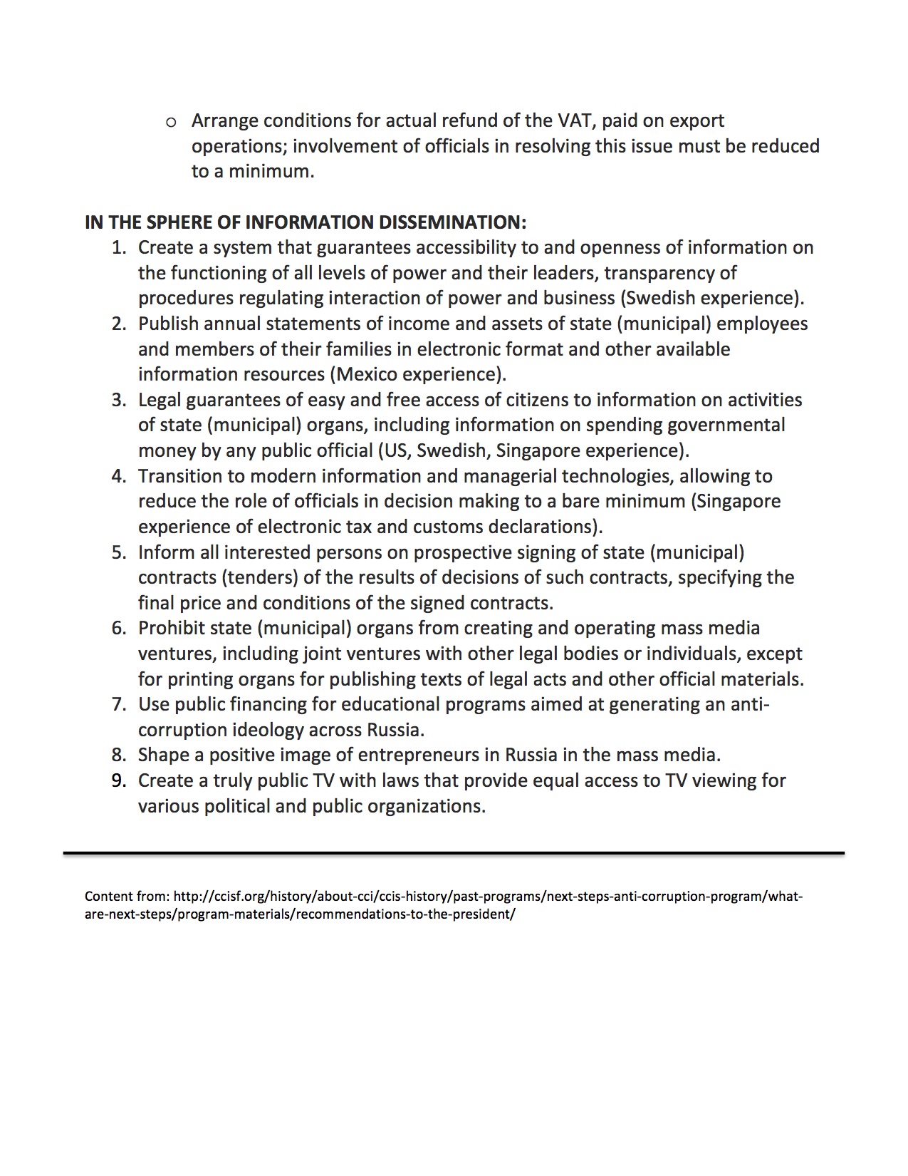 Recommendations for the President of the Russian Federation